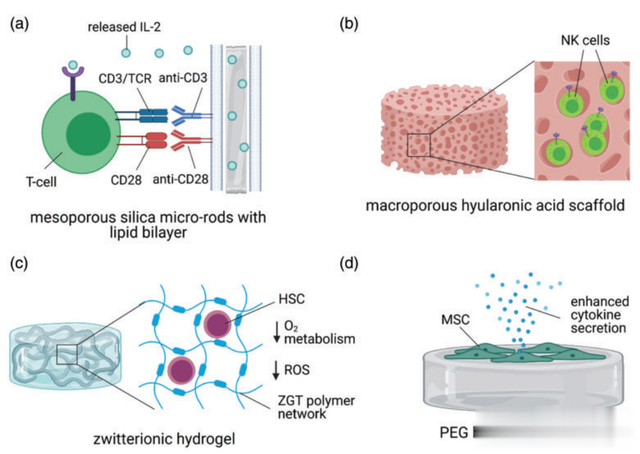 (a)涂有IL-2的介孔二氧化硅微棒和抗CD3/CD28修饰的流体脂质双分子层,增强了原代 T 细胞的扩增能力。