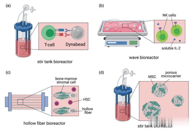 为提高NK细胞的扩增效率,基于生物反应器和生物材料的策略陆续出现。有证据表明,在组织培养瓶、氟聚合物细胞培养袋和波浪式生物反应器三种体系中,发现生物反应器培养的NK细胞,纯度和功能性细胞毒性更高。